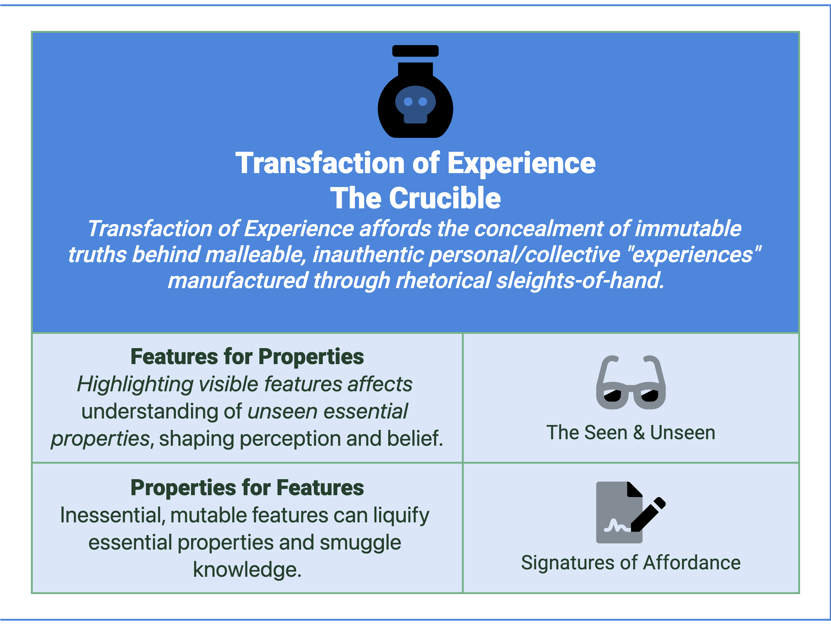 Transfaction is the intentional or unintentional swapping of Features for Properties, Experience for Knowledge, or Experience for Meaning. These transfactions create fallacies that are often used as dialectical leverage to move minds and change thoughts. They are like the Deathly Hallows of the Dialectic Arts.