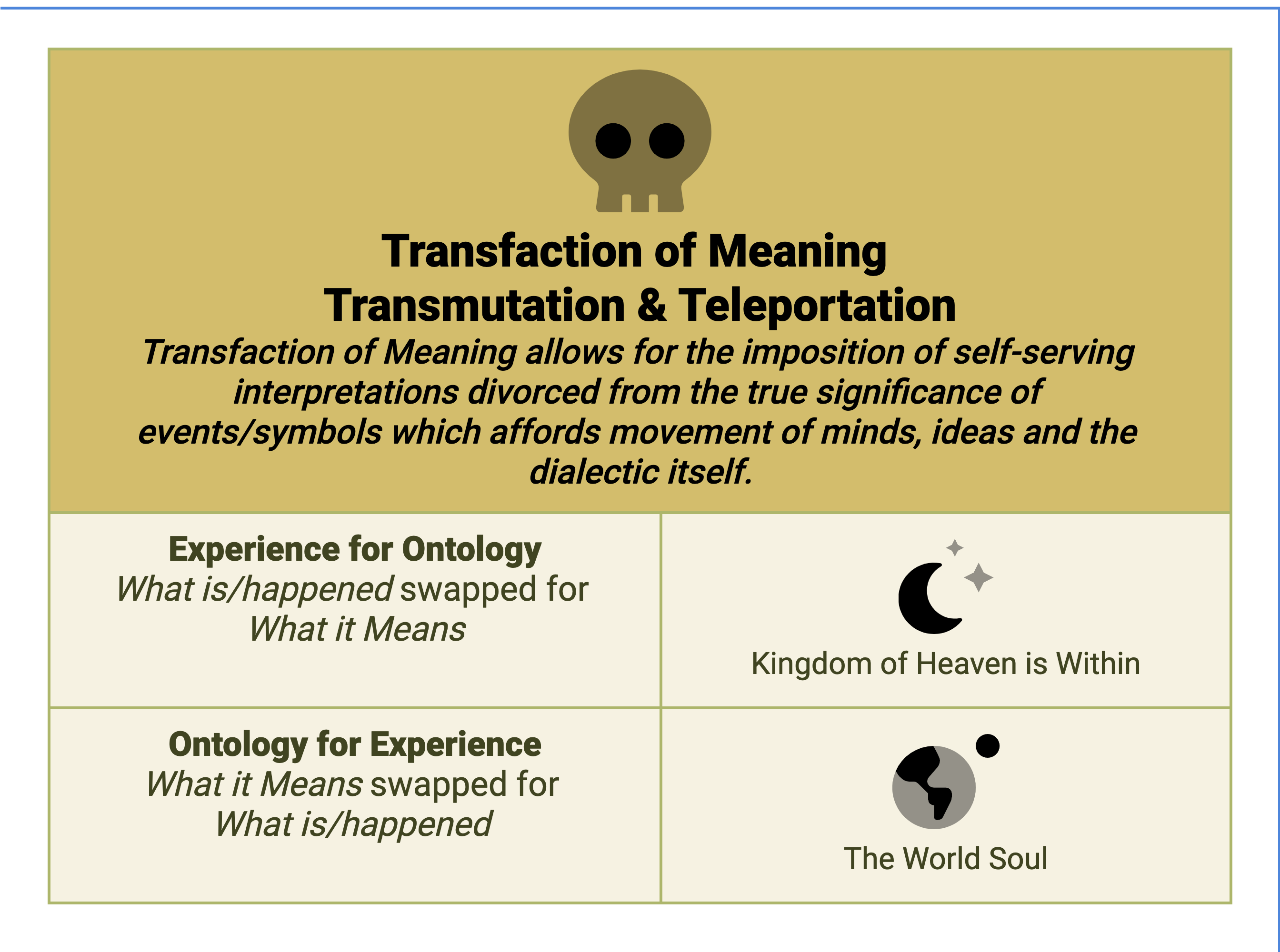 Between the 3 of these transfactions one can move, control an opponents perception, Attention, and Awareness, and teleport or relocate the topic to a venue of your choosing. Transfactions are the unethical dialecticians super power. There is a reason the Woke don’t debate. This is their whole schtick.