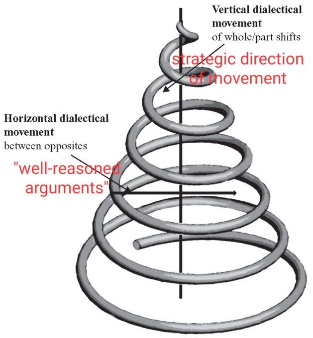 The top of the vertical axis of the spring is where we’re going, but we’ve got to go round and round the dialectic spring to get there. It’s a long process of discovery. But the skilled dialectician knows where they want to go, and it’s possible to transcend the argument; to get a glimpse or a vision of that transcendence.