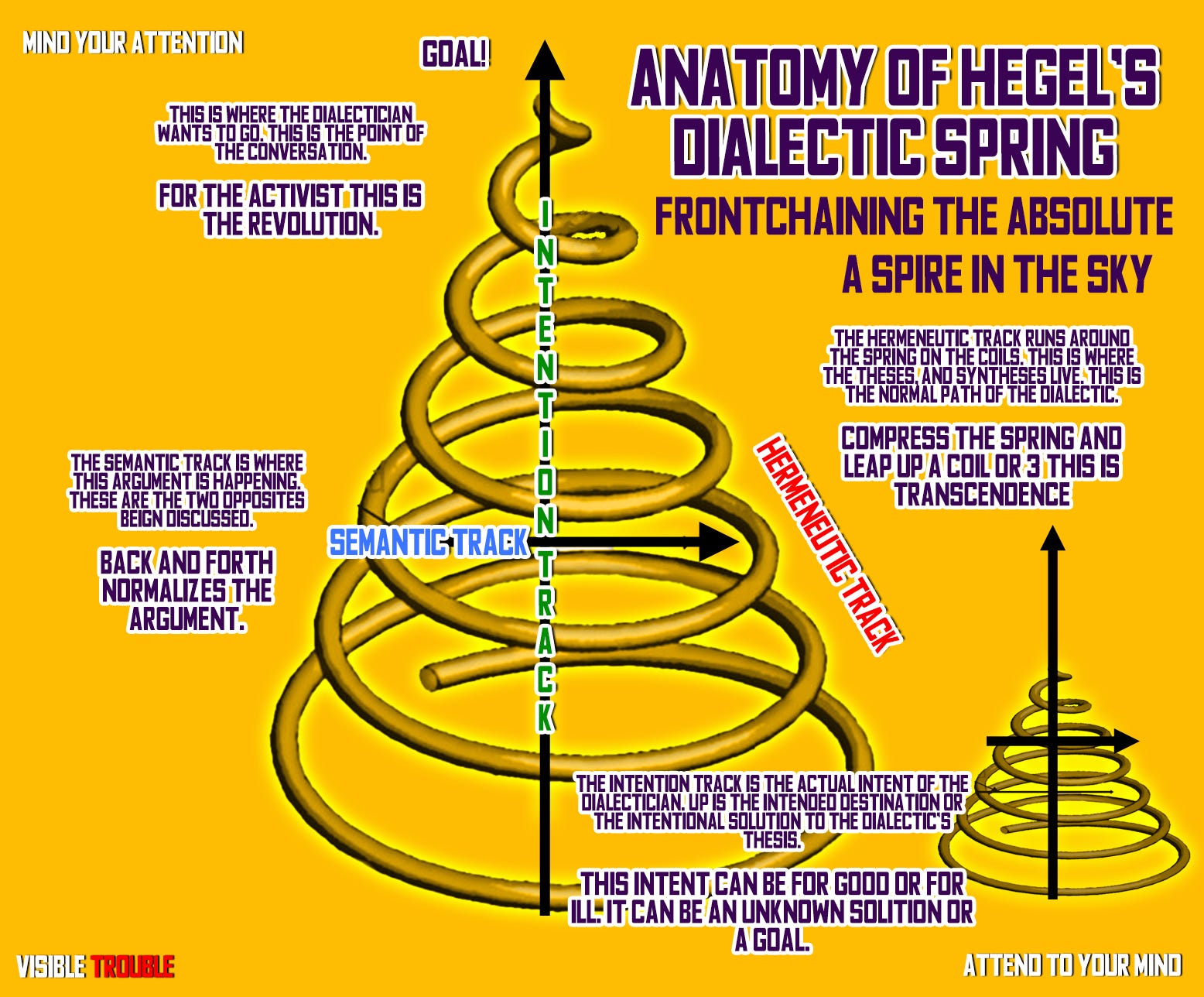 Some of you may know Hegel’s Dialectical Spring™. It’s a model that discloses how the dialectic can be used to radically alter the intellectual landscape. This model depicts an instrumental application of the dialectic, the kind of application intersectional marxists, reactionaries, and other collectivists employ that is not quite above board and of dubious ethical standards.